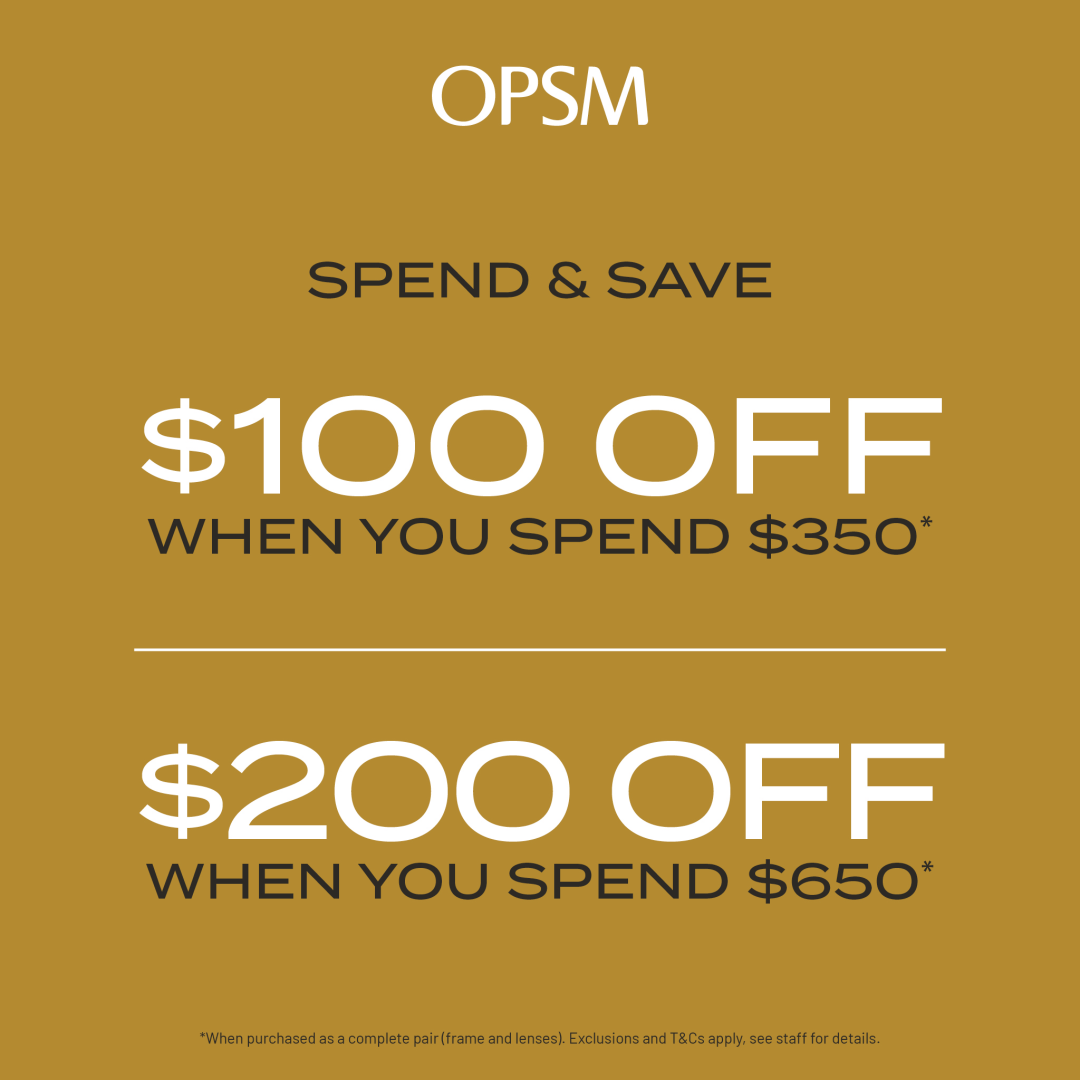 At OPSM, get $100 off frame and lenses when you spend $350* or $200 off when you spend $650*!